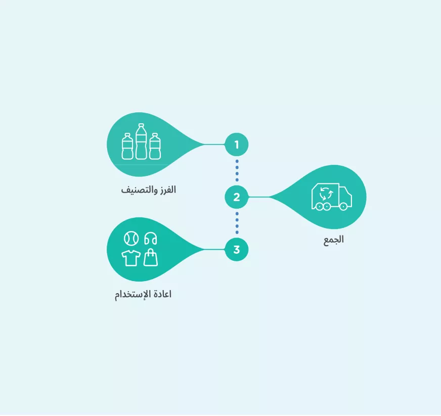 جميع قناني مياهنا البلاستيكية المصنوعة من مادة تريفتالات الإثيلين المتعدّد (بي اي تي باللغة الإنكليزية) قابلة لإعادة التدوير. وبعد معالجتها، يتم تنظيفها وتجفيفها و تذويبها إلى حبيبات بلاستيكية صغيرة قابلة لإعادة التدوير لتحويلها مجدداً إلى منتجات مفيدة اخرى.