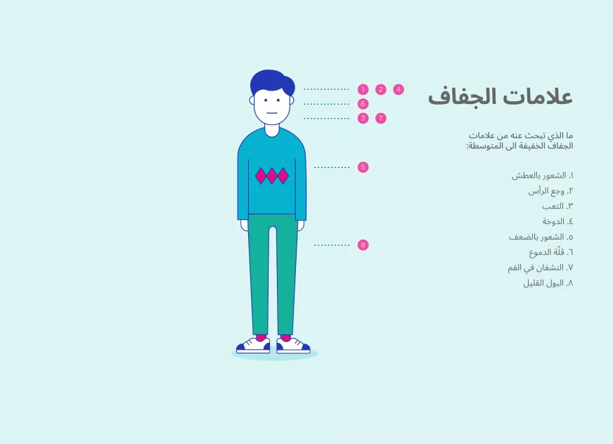 يكون الأطفال والأولاد والمتقدمون في السن عادة عرضة للجفاف أكثر من غيرهم. إلا أننا كلّنا، مهما بلغت أعمارنا، قد نتساءل في وقت من الأوقات، إذا كنا مصابين بالجفاف. ألقوا نظرة على الرسم البياني لتفحّص قائمة عوارض حالات الجفاف الخفيفة والمعتدلة.